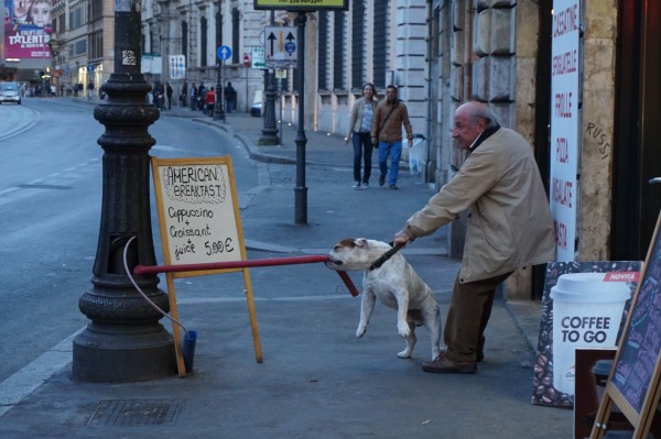 Neboli sme škodoradostní, ale bolo to osviežujúco vtipné. Určite by sme sa nenazdali, že sa ešte stretneme. Ale stalo sa. O dva dni som zrazu v úplne inej časti Ríma zaostrila na psa a vedľa neho kráčal hnedý kabát. Bola už noc. Na druhý deň ráno, v deň nášho odchodu, som poznamenala, že by bola sranda, keby sme toho muža ešte dnes na rozlúčku stretli. Ledva som to dopovedala, kráčal nám oproti... Muž a jeho pes a jeho príbeh... Nepoznám ho, ale môžem si ho domýšľať. každý deň vytvoriť iný. Ale som si istá, že príbeh toho muža je rovnako veľkolepý, ako Rím samotný... Mám tušenie, že i trochu smutný...